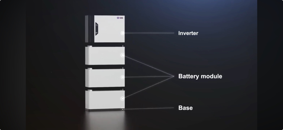 - All-in-one thuisbatterij systeem, 1 toren geintegreerde batterij modules, batterij management systeem en omvormer.