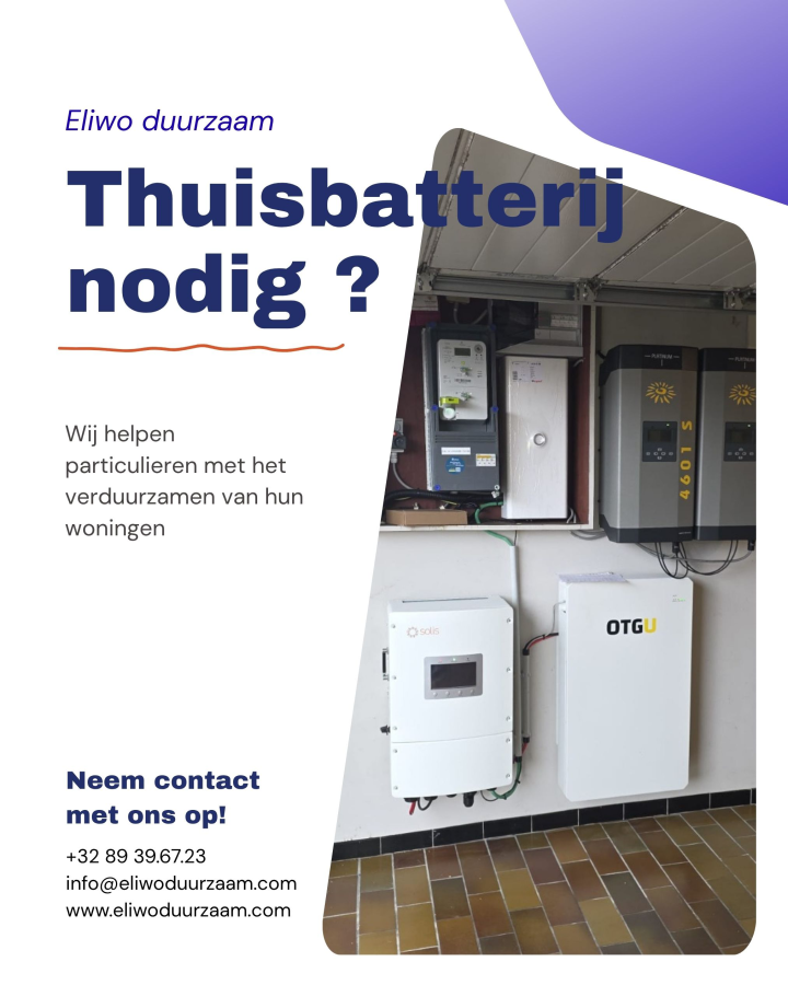Eliwo Duurzaam staat voor slimme en betaalbare energieoplossingen voor particulieren. Wij begeleiden klanten van A tot Z in hun overstap naar duurzame energie, met een sterke focus op kwaliteit, transparantie en persoonlijk advies.Onze expertise ligt in thuisbatterijen, energiebeheer (EMS) en het optimaal benutten van zonne-energie. Door de veranderingen in de energiemarkt – zoals de digitale meter en variabele energieprijzen – helpen wij klanten om hun eigen verbruik te maximaliseren en hun energiefactuur structureel te verlagen.